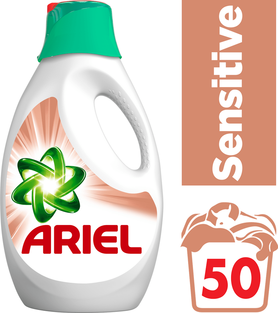 Prací gel Ariel Sensitive skvěle odstraňuje skvrny už při prvním praní a je ideální na jemné prádlo. Díky aplikačnímu uzávěru jím lze také ošetřit skvrny již před praním. Ačkoliv je Ariel tvrdý ke skvrnám, k prádlu je velmi šetrný.