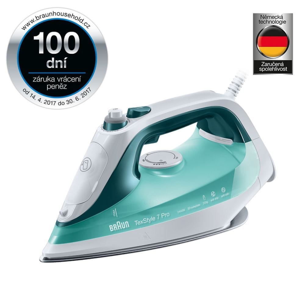 Napařovací žehlička BRAUN TexStyle 7 Pro SI 7042 GR s eloxovanou 3D zaoblenou žehlicí plochou s výbornou kluzností a odolností pro poškrábání, ergonomickou uzavřenou rukojetí a přesnou špičkou. Systém samočištění, funkce AntiDrip proti odkapávání vody ze žehlicího prkna a možnost vertikálního žehlení.